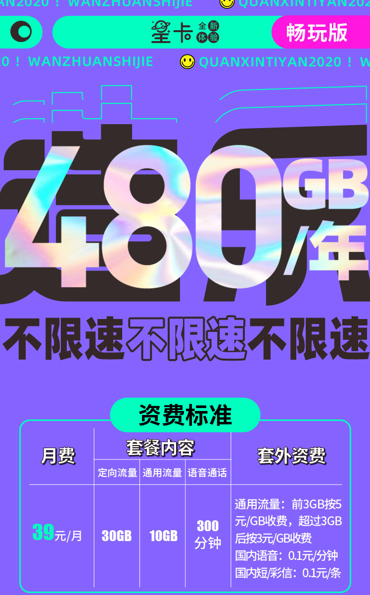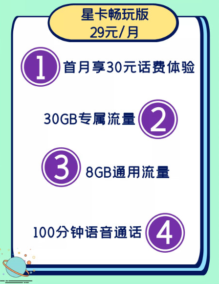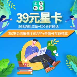 星卡套餐月基本费39元,包含30GB爱奇艺、腾讯视频、优酷视频、西瓜视频、抖音短视频、抖音火山版、快手、网易云音乐等定向流量免费、5GB国内通用流量、300分钟国内语音通话,超出资费:国内流量:套外总使用流量前3GB:167MB按0.03元/MB收费,达到167MB时,额外赠送857MB流量(即5元/GB),即每超出1GB按照5元/GB收费;超过3GB后:前100MB按0.03元/MB收费,达到100MB时,额外赠送924MB流量(即3元/GB),即每超出1GB按照3元/GB收费,国内通话:前200分钟按0.1元/分,达到200分钟时,额外赠送100分钟(即每300分钟语音收费20元),国内短/彩信:0.1元/条,当月套餐内通用流量未使用完可以结转至次月使用。
